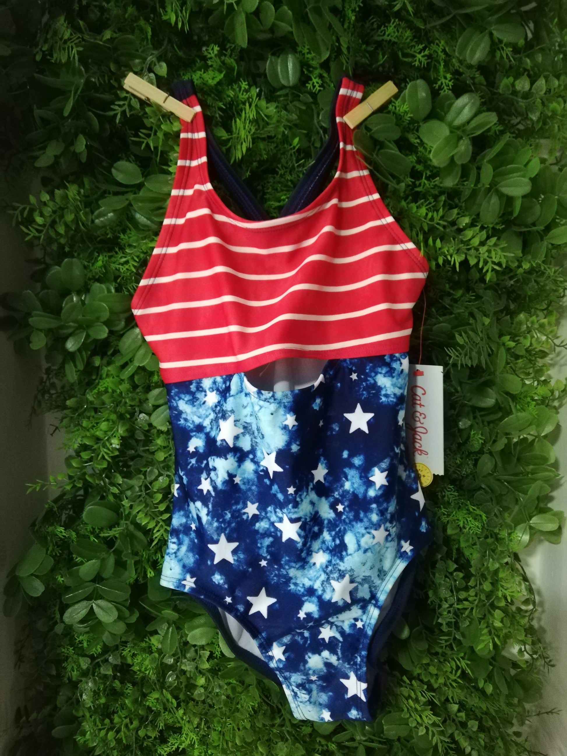 Enterizo con estampado americano y diseño cruzado atrás, con pequeña abertura en la parte delantera.