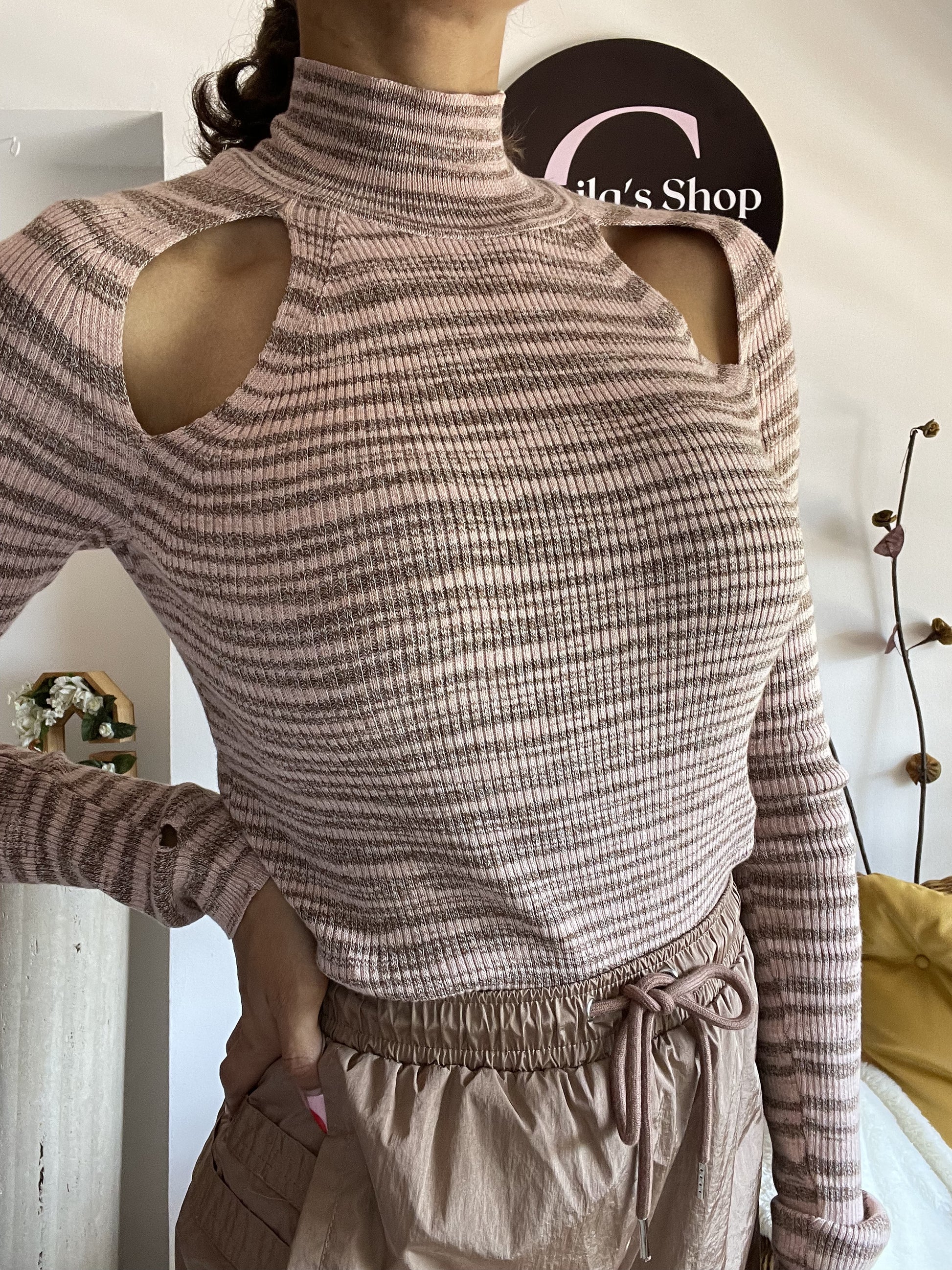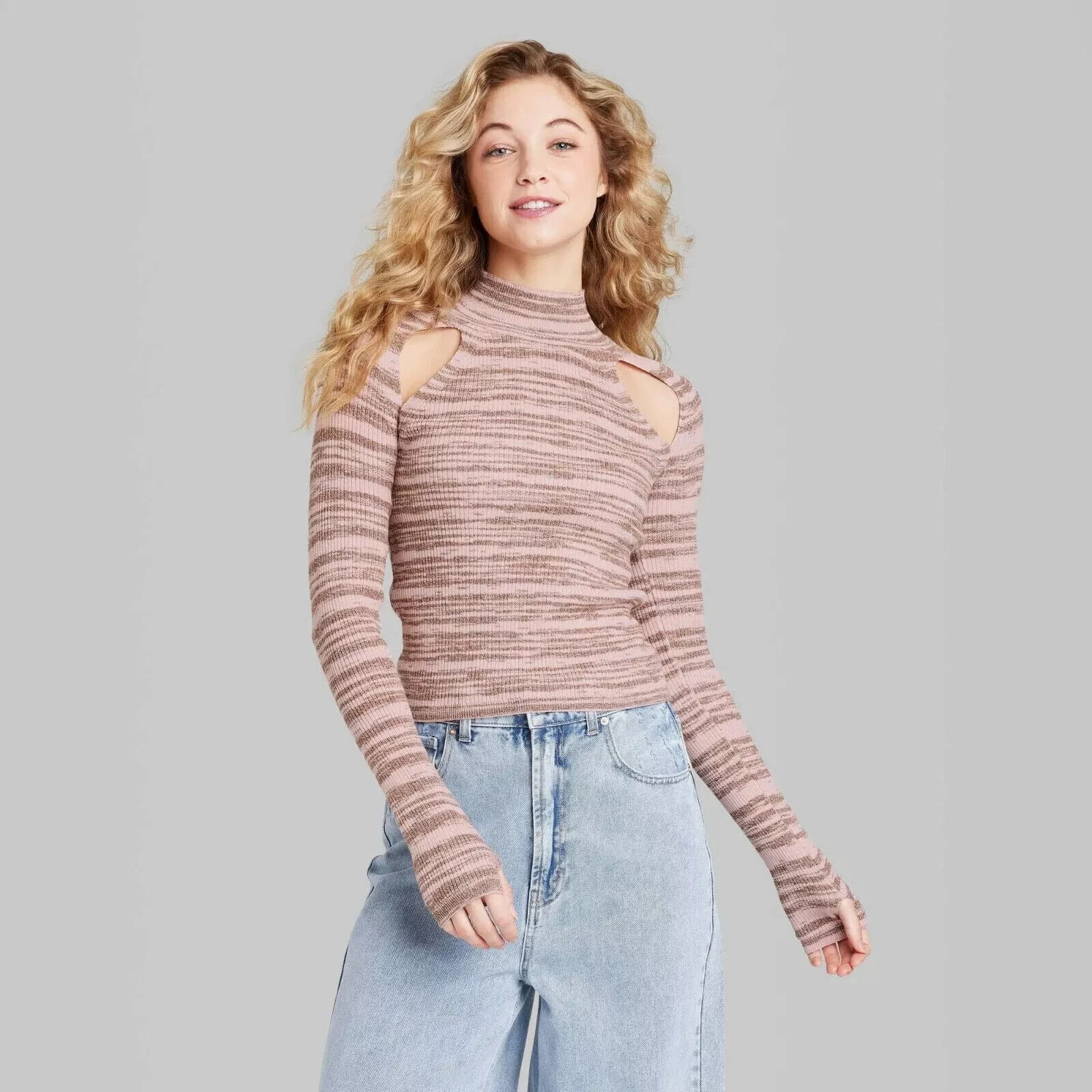 Puños con orificios para los pulgares y llamativos detalles recortados en los hombros.